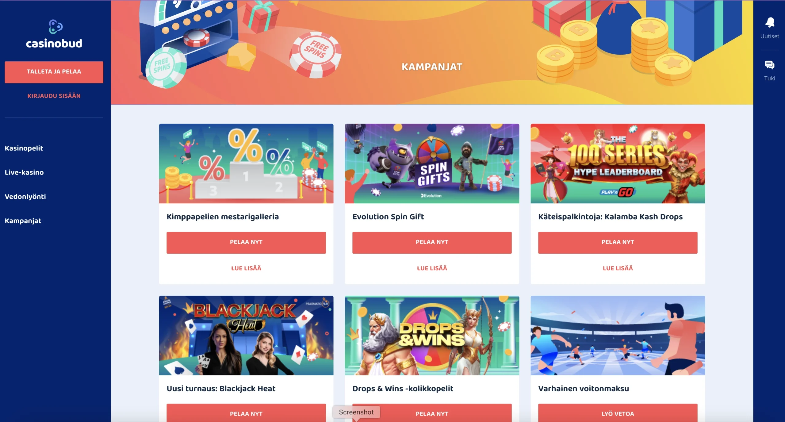 Emme löytäneet sivustolta minkäänlaista kanta-asiakas- tai VIP-ohjelmaa. Kaikki aktiiviset kasinobonukset ja tarjoukset löytyvät aina sivuston Kampanjat-välilehdeltä. Kannattaa siis seurata tätä osiota tasaisin väliajoin.