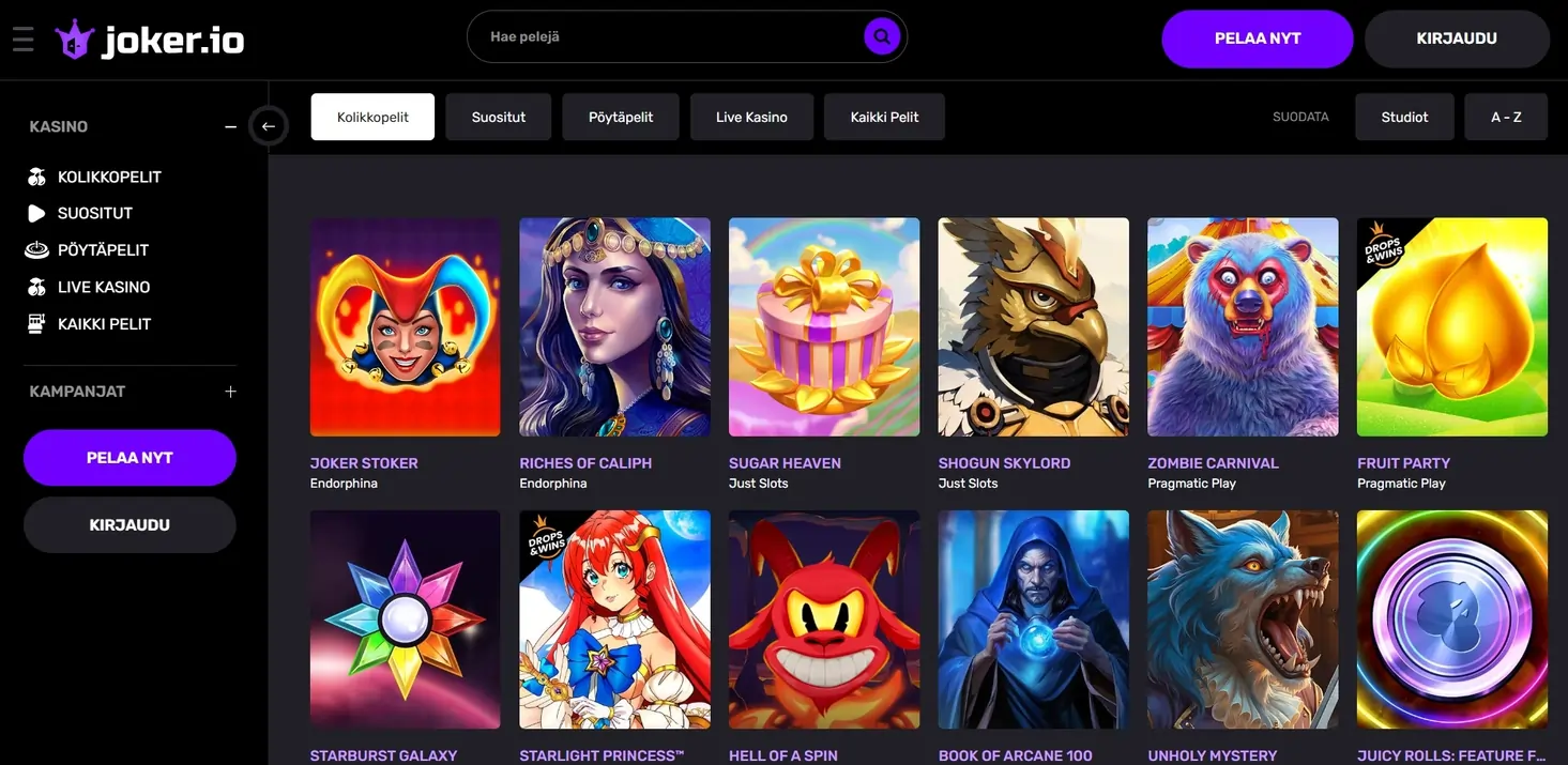 Kolikkopelit ovat Joker.io Kasinon keskiössä ja valikoimasta löytyy suosituimpia nimikkeitä, kuten Starburst, Book of Dead, Sugar Rush ja Gonzo’s Quest. Mukana on myös uusia tulokkaita, kuten Pragmatic Playn Genie’s Gem Bonanza sekä Lobster House. Pelit erottuvat erinomaisilla grafiikoillaan ja innovatiivisilla ominaisuuksillaan. Joker.io Kasino on valinnut vain parhaat pelit tarjontaansa.