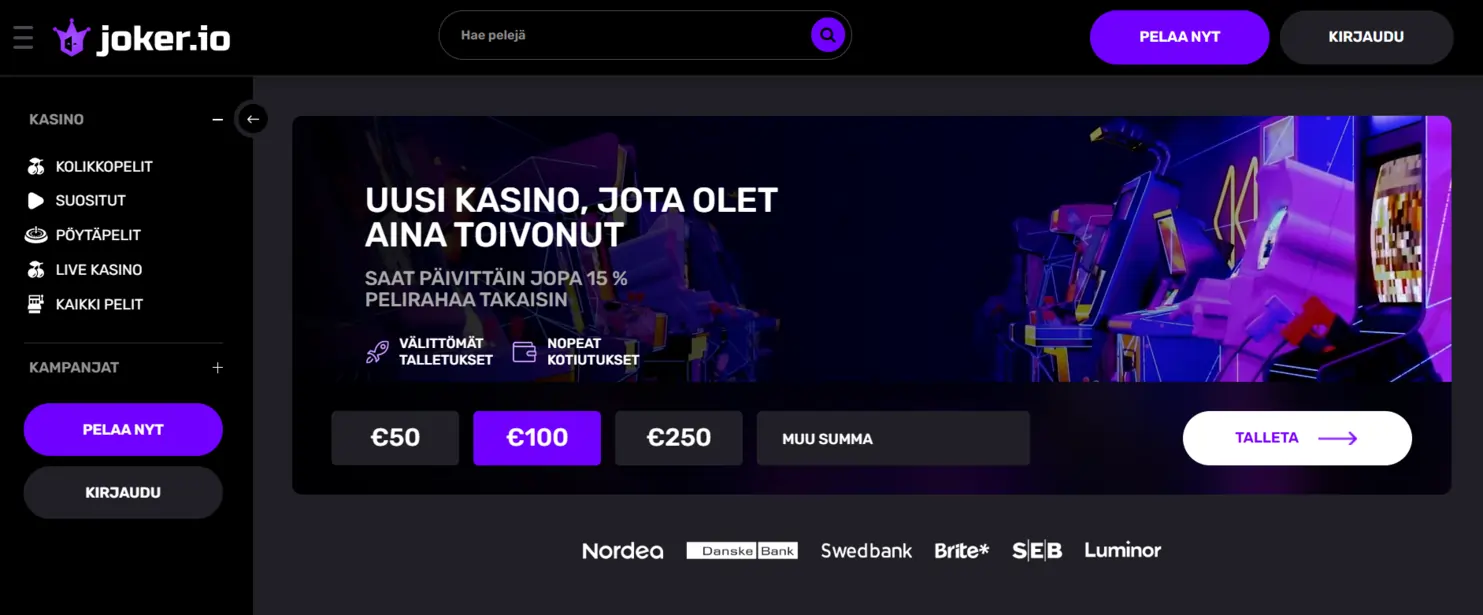 Joker.io on pay n play -nettikasino, joka tarjoaa suomalaispelaajille välittömät talletukset, nopeat kotiutukset, houkuttelevia bonuksia sekä jopa 15 % käteispalautusta. Kasino on suunnattu erityisesti suomalaisille ja sen Viron pelilisenssi takaa turvallisen ja luotettavan peliympäristön sekä verovapaat voitot. Kasinolla on tietysti myös suomalaista asiakaspalvelua, mikä on todella hyvä asia. Asiakaspalvelu toimii nopeasti ja on asiantuntevaa.